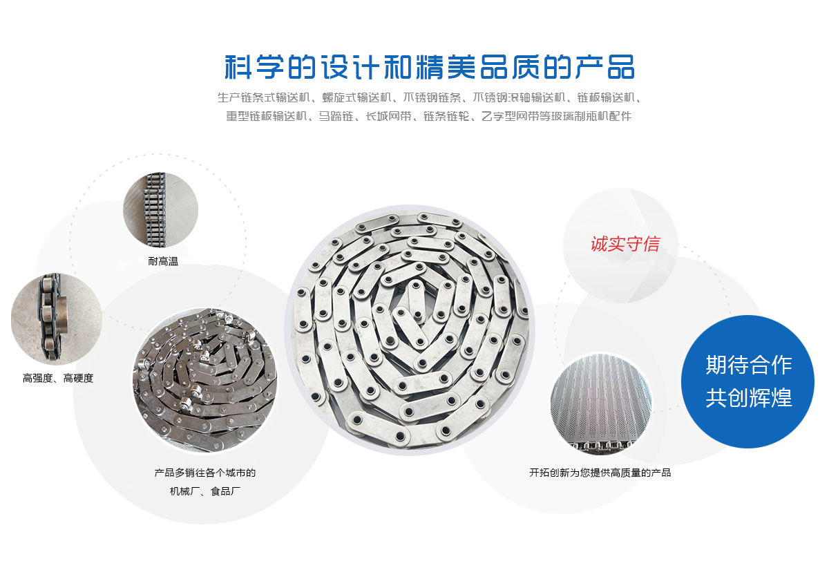 生產鏈條式輸送機、螺旋式輸送機、不銹鋼鏈條、不銹鋼滾軸輸送機、鏈板輸送機、重型鏈板輸送機、馬蹄鏈、長城網帶、鏈條鏈輪、乙字型網帶等玻璃制瓶機配件,食品機械配件及各種網帶的專業廠家 ,多年來產品暢銷各地玻璃廠和食品廠,在玻璃制品等行業中享有較高的聲譽。公司集摸具開發、機械設計生產,銷售于一體的生產型企業。生產的自動化流水線金屬傳動網帶、鏈條等產品廣泛用于玻璃機械、食品機械、化纖機械、醫藥、電子、烘干機械、輪胎機械等行業。產品多銷往各個城市的機械廠、食品廠和一些涉及流水線或自動化設備的公司。